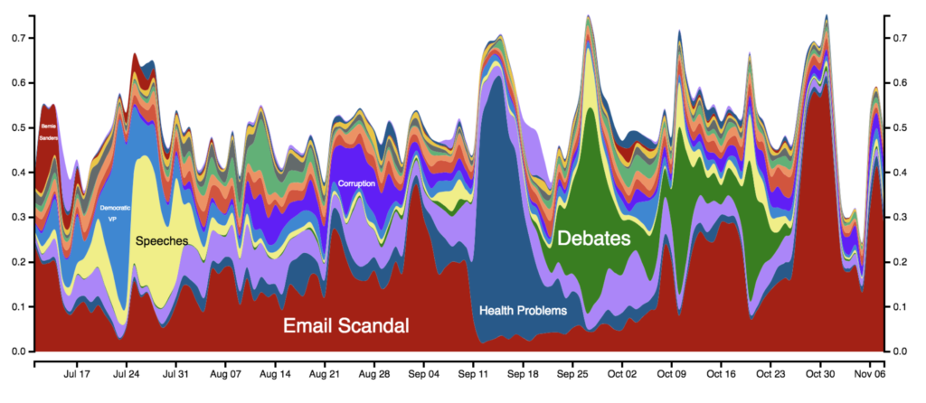 A June 9, 2020 post titled "The words that made a difference in the 2016 election" on the University of Michigan blog also sought to explain research published on recent political trends. This post summarized the findings of a new book entitled "Words That Matter: How the News Media Environment Allowed Trump to Win the Presidency." A data table, indicating the words that most voters remembered being covered by the media in 2016 tracks the relationship between words and dates: